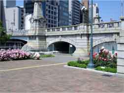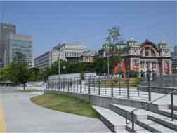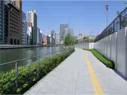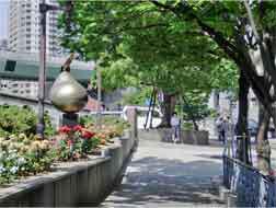 中之島公園のバラ園から難波橋の下をくぐり、土佐堀川沿いを歩きます。