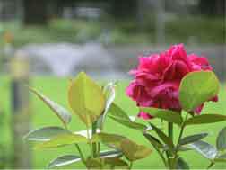 テニスコート側のバラ園の入り口に、とってもきれいな色の木が目を引きます。